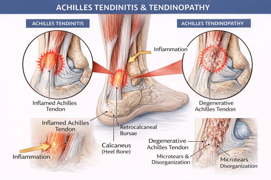 The Achilles tendon is subjected to high loads during walking, running and jumping. Overuse, sudden training changes and calf weakness can contribute to tendon irritation.